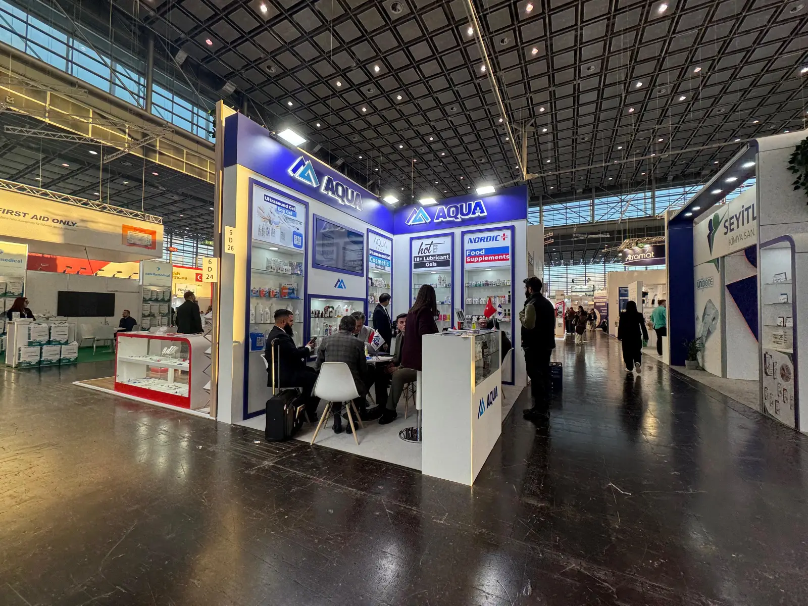 Uluslararası ziyaretçilerin beklentileri de dikkate alınarak tasarlanan bu yapı, global etkinliklerde sıkça aranan bir medical product exhibition stand formunu yansıtarak AQUA’nın markalaşma etkisini güçlendirdi. Bu bütünsel tasarım yaklaşımı, medikal, farmasötik ve kozmetik ürünleri bir arada sergileyen markalar için yüksek görünürlük, düzen ve profesyonellik sunan kompakt bir çözüm ortaya koydu.